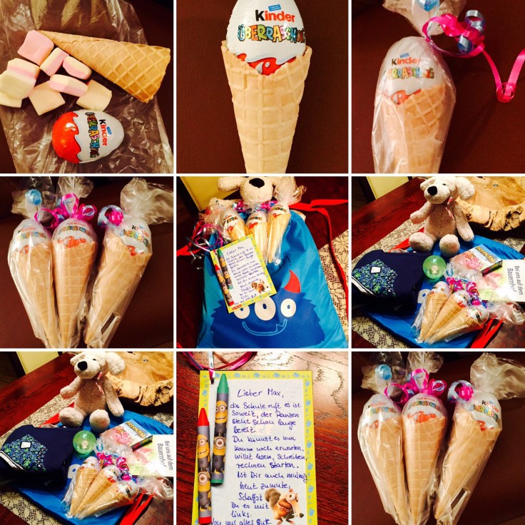 Wir sind am Samstag zu einer Einschulung eingeladen. Ich habe heute das Geschenk für den kleinen Schatz zusammengestellt. Er bekommt einen Turnbeutel mit Sportzeug und ein paar Extras. Damit das ganze nicht so langweilig daherkommt, habe ich noch kleine Zuckertüten aus je einer Eiswaffel, Marshmellows und einem Überraschungsei zusammengestellt. Diese Tüten habe ich in je einen Frühstücksbeutel gepackt und an den Turnbeutel gebunden. Gleich sieht das Geschenk nach Einschulung aus. Die Tüten kann man auch gut als Tischdeko nutzen, wenn man selber eine Einschulung ausstattet. Nun sind wir für Samstag gewappnet und freuen uns auf die Party 😊🎉😊
