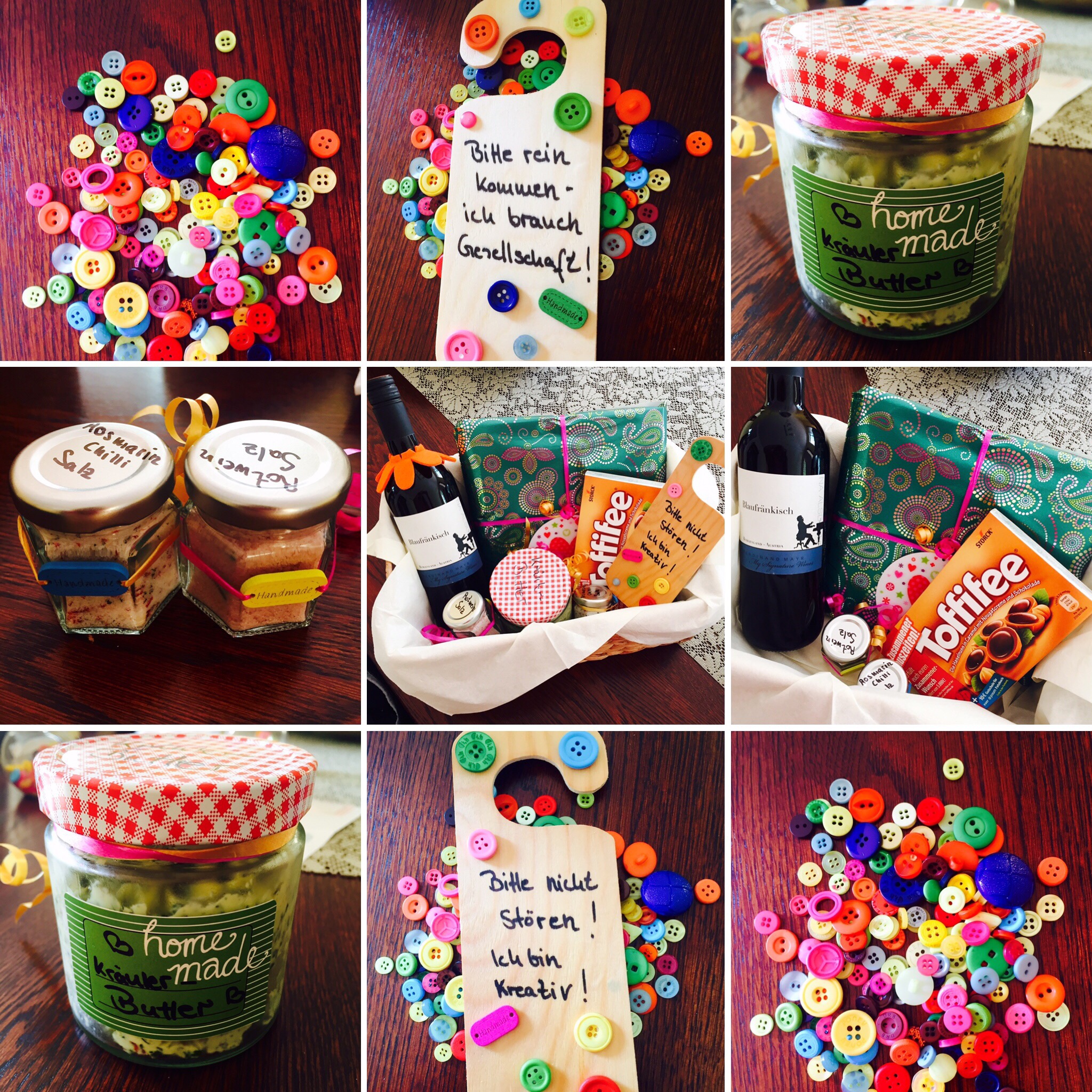 Heute hat eine liebe Freundin von mir Geburtstag. Und natürlich stellt sich wie bei jeden Geburtstag die Frage „was soll ich nur schenken?“ Ich habe mir gedacht was persönliches kommt immer gut an. Also habe ich ein Fotobuch von unserem gemeinsamen Weiberwochenende erstellt. Diesmal über „Lalalab“ gleich über das iphone. Das ist super einfach und sehr schnell zusammengestellt. Kann ich wirklich nur empfehlen. Ich hoffe Sie freut sich 🤗 Da meine Freundin gerade dabei ist, sich ein Bastelzimmer auszubauen, habe ich ihr noch für ruhige und kreative Stunden ein Türanhänger mit „Bitte nicht stören“ bzw. mit „Bitte reinkommen“ gebastelt. Den Türanhänger habe ich mit bunten Knöpfen dekoriert. Die Knöpfe habe ich einfach mit Bastelkleber angeklebt. Dazu bekommt sie mein selbstgemachtes Salz und meine Kräuterbutter geschenkt. Noch eine Flasche guten Wein und was süßes für die Seele und fertig ist das Geschenk. Drückt mir die Daumen, dass ihr das Geschenk gefällt.