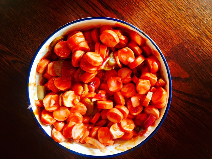Einfach die Wiener, Zwiebel und saure Gurke in kleine Stückchen schneiden. Dann 4 -6 EL Tomatenketchup und 3 – 4 EL Curryketchup drunter mischen. Nun das ganze noch mit Pfeffer, Salz, Paprika und Chili abschmecken. Die Zubereitungszeit liegt bei ca. 10 Minuten.