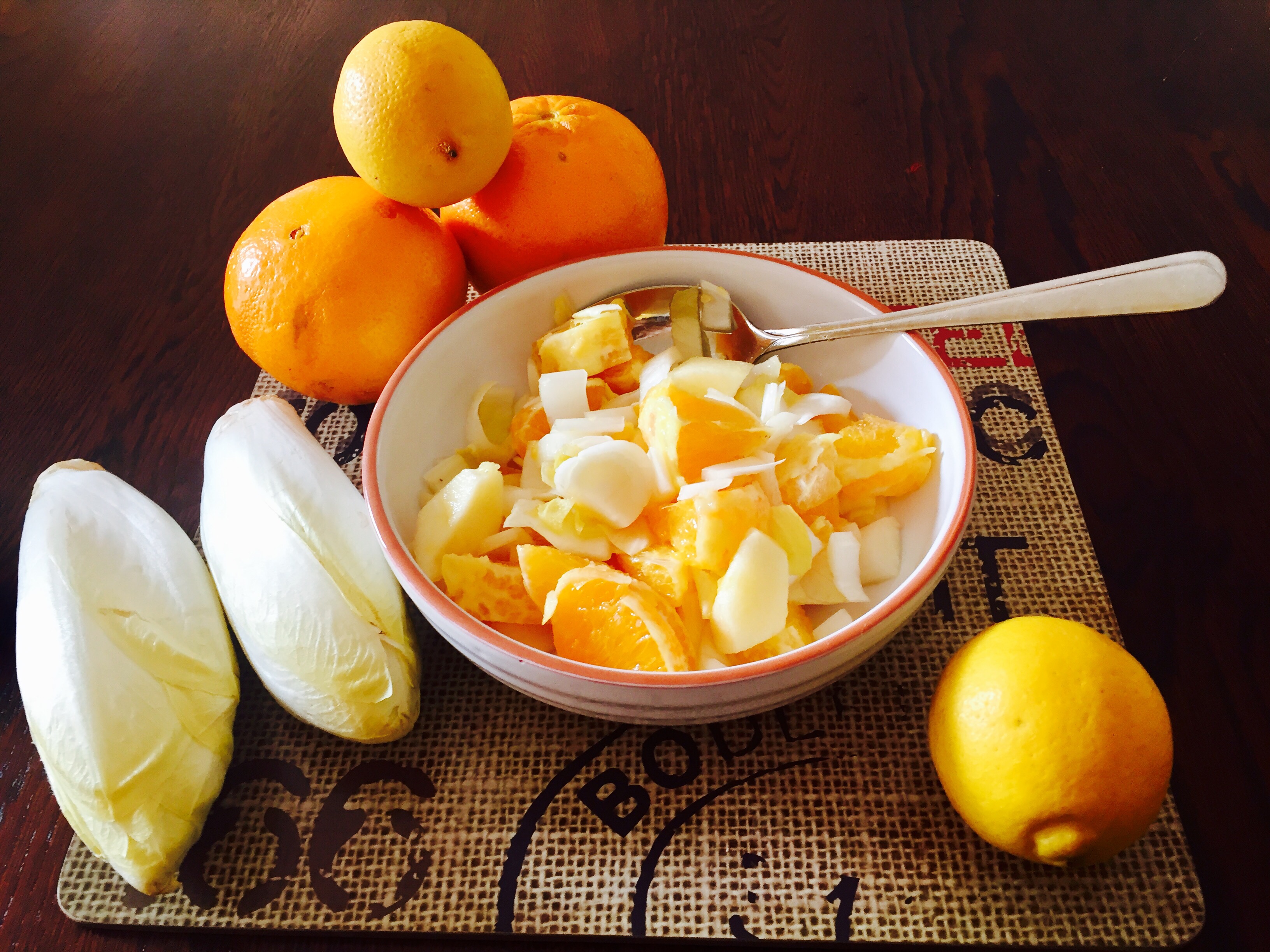 Wie bekommt man ein Mann dazu, dass er Vitamine zu sich nimmt? Man muss das Obst in mundgerechte Stücke schneiden. Also habe ich ein Obstsalat gemacht. In diesem Fall mit Orangen, Äpfeln und Chicorée. Der Chicorée gibt dem Salat eine besondere Note.