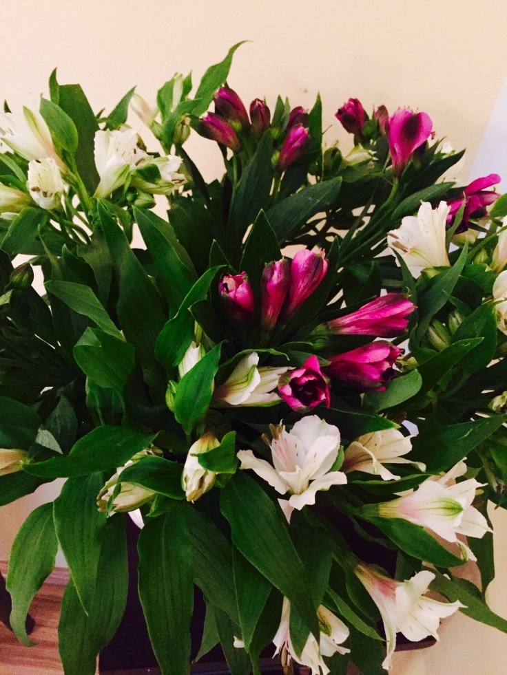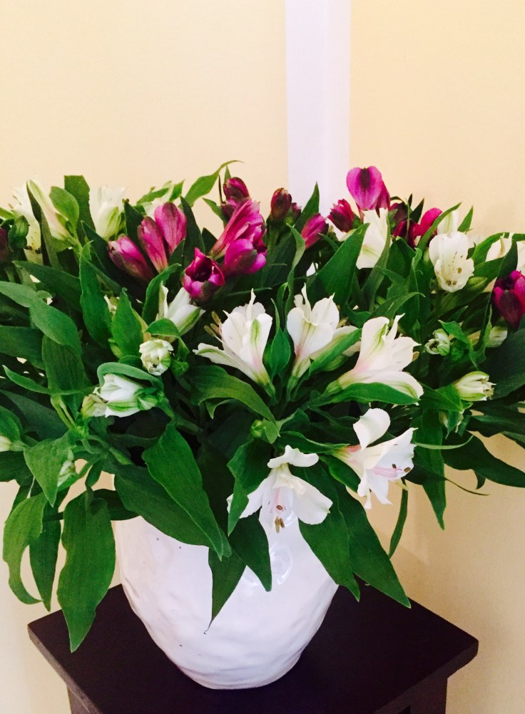 herrscht bei Euch auch momentan Sommerpause? Also bei uns ist es grau in grau, unter 20 Grad und gleich fängt es mal wieder zu regnen an. Der Sommer fällt quasi in Wasser …. aber nicht bei mir im Haus! Ich hole mir den Sommer durch einen schönen Blumenstrauß ins Wohnzimmer. Diesmal habe ich mir weiße und lilafarbene Alstromerien, auch Prinzesslilien genannt, zusammengestellt. Ich finde das Weiß und Lila im Zusammenspiel mit den grünen Blättern wirkt sehr harmonisch.