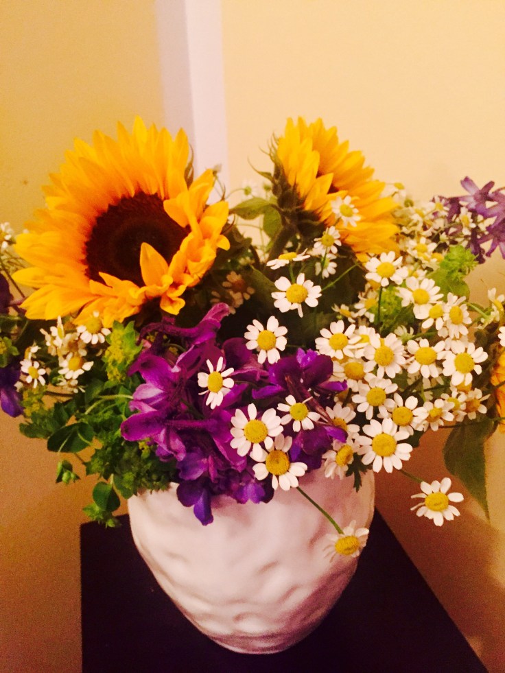 wie Ihr ja schon mitbekommen habt, ich liebe Blumen. Und heute haben diese mich mal wieder angelacht. Am Donnerstag, also heute ist mein Einkaufstag …. und was sehe ich da mitten im Supermarkt „Saisonblumensträuße“ – so lautet die Bezeichnung auf dem Etikett. Die Sonnenblumen haben mich angestrahlt und mir zugeflüstert, wie schön sie doch in meinem Wohnzimmer aussehen würden. Und da konnte ich nicht wiederstehen. Nun stehen die Blumen in der Vase und bringen das Strahlen der Sonne ins Haus. Und wie man sieht, es müssen nicht immer Rosen und Orchideen sein… auch eine Sonnenblume kann glücklich machen.