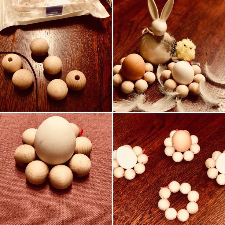 wer meinen Blog kennt, der weiß, dass ich schon ein paar Projekte aus Holzkugeln gebastelt habe. Nun habe ich auf Pinterest diese wunderschönen, aber einfachen Eierbecher aus Holzkugeln entdeckt. Da ich noch Holzkugeln übrig hatte, musste ich gleich loslegen und welche basteln. Es hat mir richtig in den Fingern gekribbelt. Man benötigt einfach eine Schnur und 8 Kugeln. Die Kugeln auf die Schnur fädeln und zusammen binden, schon ist der Eierbecher fertig.