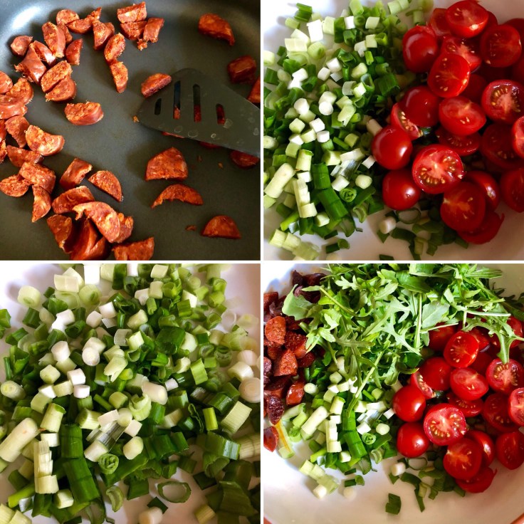 Zuerst habe den Sonnenweizen 10 Minuten gekocht. Währenddessen habe ich die Chorizo klein geschnitten und angebraten. Zeitgleich habe ich die Frühlingszwiebeln, die Tomaten und den Schafskäse klein bzw. in Würfel geschnitten. Diese Zutaten habe ich zusammen in eine Schüssel gegeben. Nun habe ich den Rucola gewaschen und ebenfalls zu den anderen Zutaten in die Schüssel gegeben. Dann habe ich den fertig gekochten Sonnenweizen auch zu den Salat gegeben und alles gut durchmischt. Nach dem Durchmischen habe ich das Pesto und die Gewürze unter den Salat gemischt.