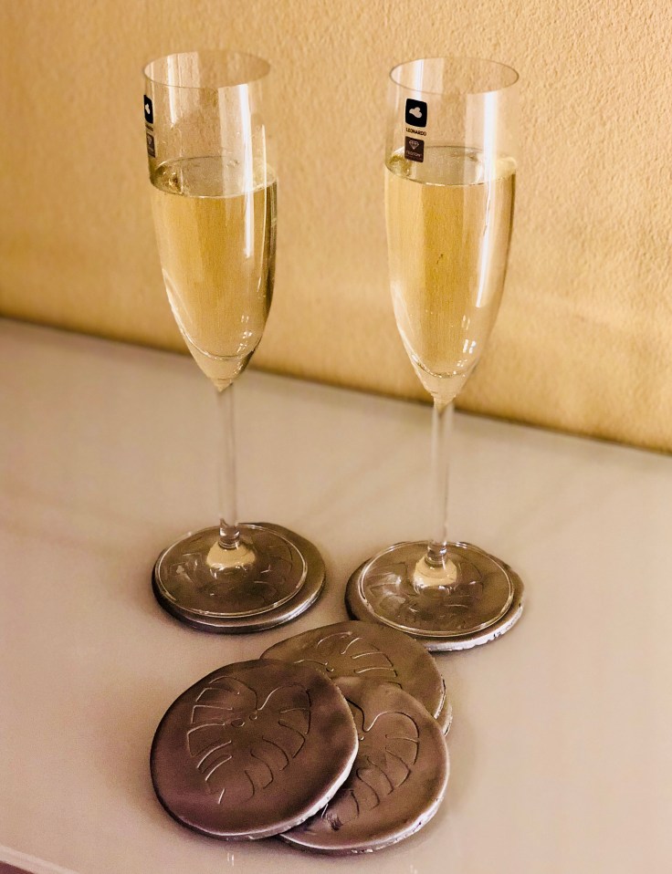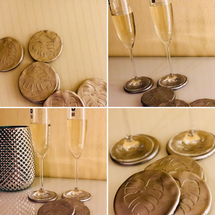 Zuerst habe ich einen Teil von der Fimo – Masse abgetrennt und weich geknetet. Das Teil habe ich dann zu einer Kugel geformt und mit der Kunstoffrolle wie Keksteig ausgerollt. Danach habe ich das kleine Pappmonstera – Blatt in die Masse mit der Kunstoffrolle hineingedrückt und dann wieder abgezogen. Nun habe ich einen Kreis mit dem Plastikbecher ausgestochen. Das ganze habe ich sechs Mal wiederholt. Die Untersetzer habe ich dann bei 110 Grad im Backofen für 30 Minuten auf Backpapier gebacken. Dadurch sind die Untersetzer ausgehärtet. Nach dem die Untersetzer abgekühlt sind, habe ich die harten Kanten leicht abgeschliffen. Am nächsten Tag habe ich die Untersetzer mit dem Acryl – Lackspray von allen Seiten besprüht und trocknen lassen. Fertig sind meine Untersetzer!