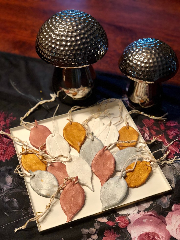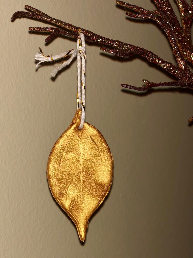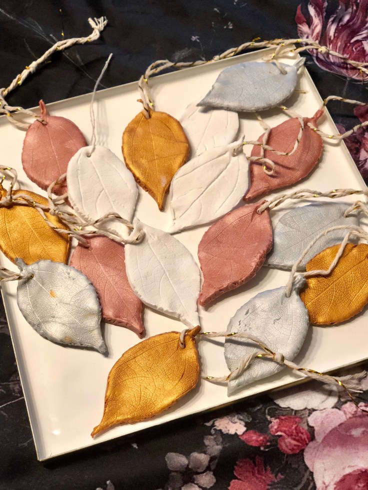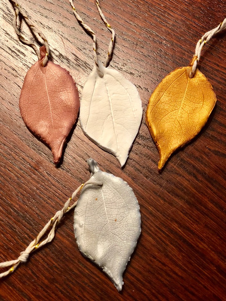 Da ich die Blätter als Anhänger für meinen Strauch benutze habe ich ein Loch mit einen Holzstab in das Blatt gestochen. Die Blätter müssen dann bei 110 Grad für 15 Minuten im Ofen gehärtet werden.