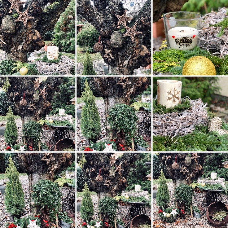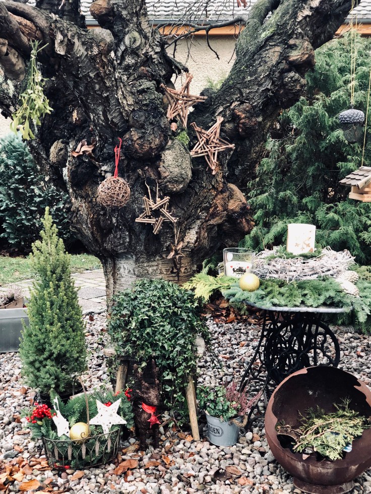 heute möchte ich Euch meine weihnachtliche Dekoration in unserem Garten vorstellen. Ich dekoriere gerne mit Naturmaterialien, aber ein bisschen Glitzer muss auch sein. Besonderer Augenmerk meiner Dekoration bekommt unser Eingangsbereich und unser Terrassenbereich unter dem Kirschbaum.