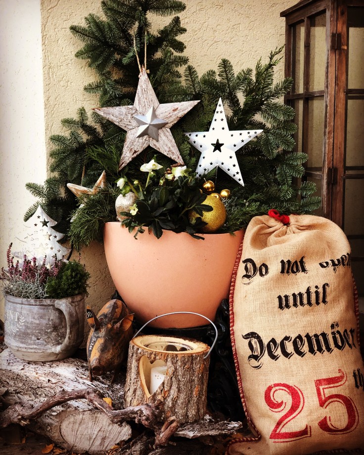 Ich habe jeweils zwei große winterfeste Töpfe mit Stacheldraht und jeweils einer Christrose bepflanzt. Für den weihnachtlichen Effekt habe ich die Töpfe mit unterschiedlichen Ästen von Nadelgehölzen (z.B. Tanne und Thuja) aufgefüllt. Dann habe ich die Töpfe mit weihnachtlicher Deko, Holzsternen, Metallsternen, kleinen goldenen Äpfeln und mit goldenen Kugeln bestückt. Für eine harmonische Komposition habe ich noch mit Holz, weiteren Gefäßen und Laternen gearbeitet.