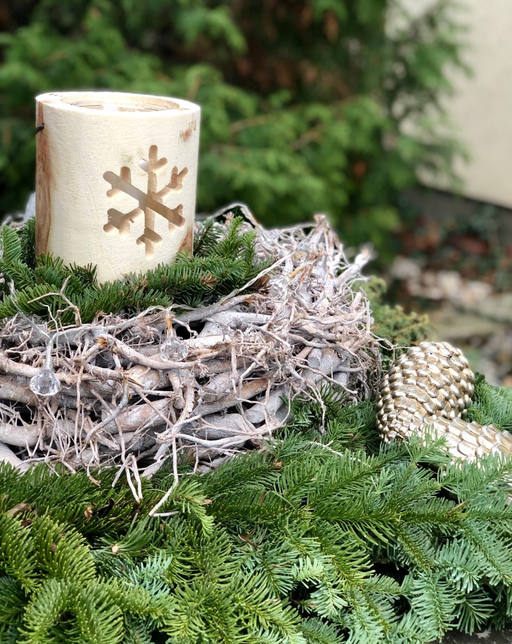 Dazu noch ein Hocker mit Efeu, eine kleine Zuckerhuttanne, ein Mispelzweig und ein paar Deko – Elemente und fertig ist die Weihnachtsdekoration im Garten.