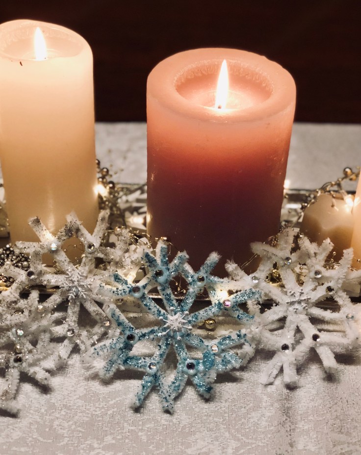 Die Gläser stehen in einem Korb, der mit etwas Moos und Gehölz befüllt. Den Korb habe ich in die Schale gestellt. Für den Wintertouch habe ich kleine weiße Sterne und eine batteriebetriebene Lichterkette in der Schale arrangiert. Ebenfalls habe ich meine selbstgebastelten Schneeflocken aus Pfeifenputzern (die Schneeflocken findet Ihr natürlich auch in meinem Blog) mit für die Deko benutzt.