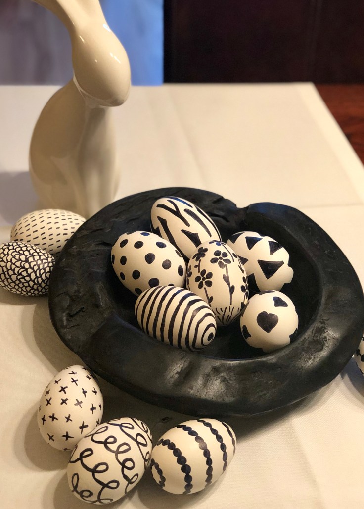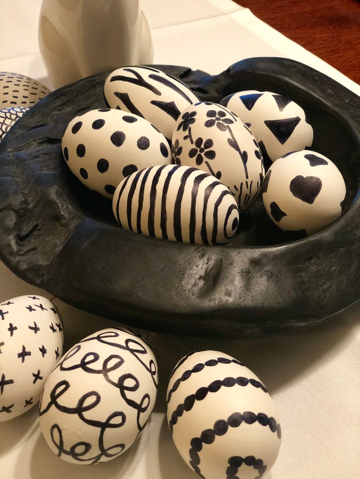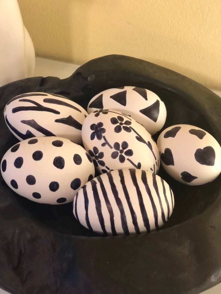 Ich finde die großen schwarz-weißen Gänseeier kommen besonders gut in meiner schwarzen Holzschale zur Geltung. Ich habe mich so sehr in diese schlichten Ostereier verliebt, dass ich mir noch mehr Gänseeier bestellen werde um auch diese noch zu bemalen. Man kann an die Eier auch auch einen Anhänger befestigen und diese dann an den Osterstrauch hängen.