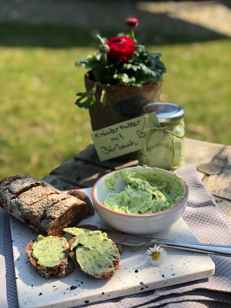 ist das nicht ein duftes Frühlingswetter – Sonnenschein, die Vögel zwitschern und der Frühling liegt in der Luft. Ich würde sagen die Grillsaison kann beginnen. Und genau dafür habe ich ein tolles Rezept – Kräuterbutter mit Bärlauch. Die passt nicht nur perfekt zu frischen Brot, sondern macht ein Stück Grillfleisch perfekt.