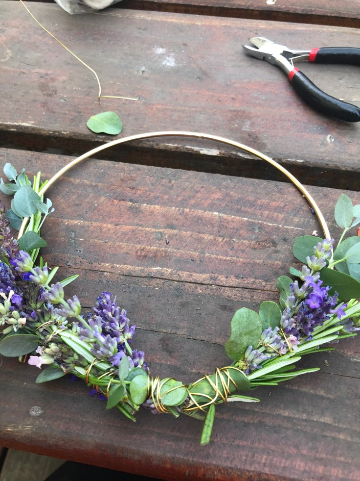 Dann habe ich die Pflanzen auf eine Länge geschnitten und mit Draht dekorativ an den Ring befestigt.