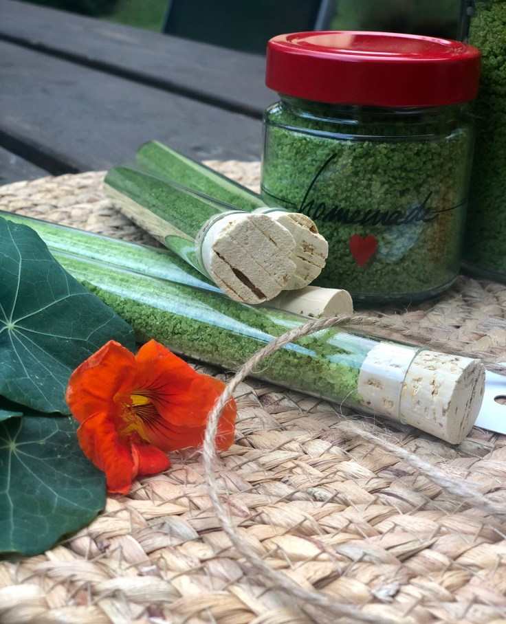 Ich habe extra viel Salz gemacht, damit ich immer ein schönes Mitbringsel habe, wenn wir eingeladen sind. Dafür habe ich mir Reagenzgläser gekauft zum Verpacken des Salzes. Ich finde das macht richtig was her. Ich liebe es ja Geschenke aus der Küche und aus den Garten zu verteilen. Und bei diesen Salz sind gleich beide Elemente verbunden. Verschenkt Ihr auch gerne selbstgemachte Sachen?