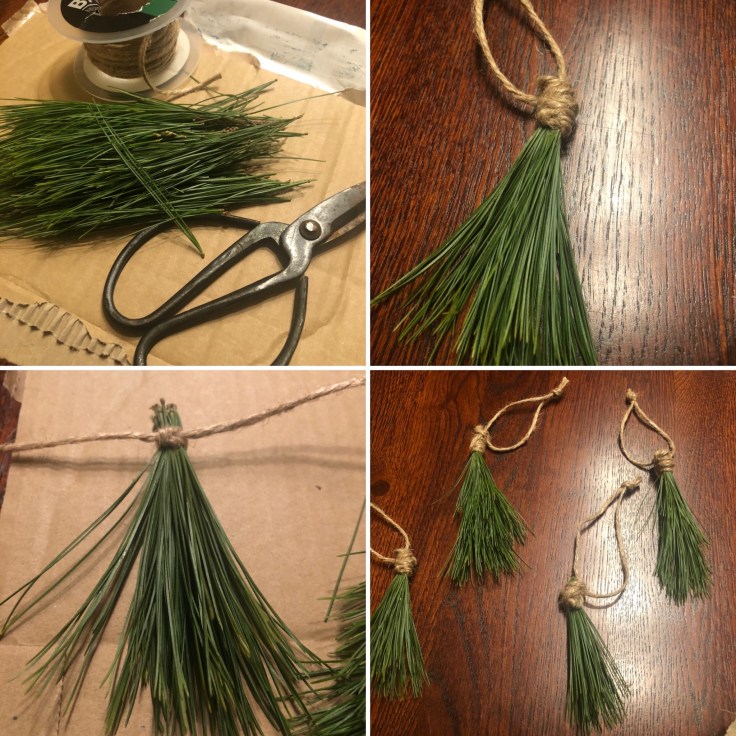 Ich habe Quasten aus Kiefernadeln und kleine Kränze aus Thujazweigen gebastelt. Die Idee hierzu habe ich bei Pinterest gefunden.