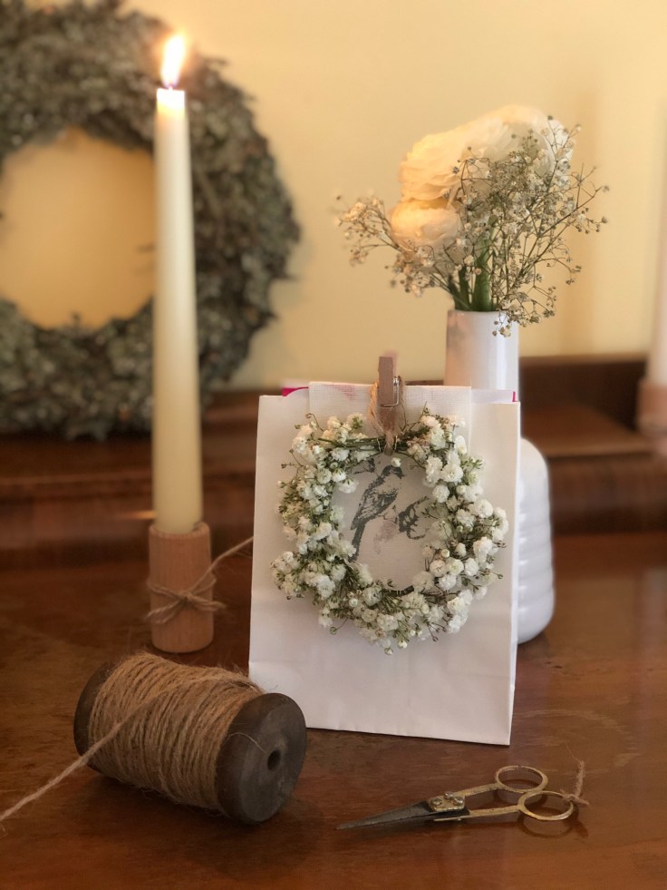 ich hoffe Ihr hattet einen guten Start ins Wochenende und seid alle gesund. Heute habe ich wieder eine schöne Verpackungsidee für ein Geschenk für Euch. Meine Schwiegermutter hat heute nämlich Geburtstag und da musste wieder eine Verpackungsidee her. Bei der grauen Einheitssuppe draußen, wollte ich mit der Geschenkverpackung ein bisschen Frühling verbreiten. Ich habe bei Depot kleine weiße Tüten entdeckt (hier funktionieren auch Butterbrottüten) mit einen dekorativen Stoffband, wo ein Vogel drauf gedruckt ist. Hier könnte man auch eine Vorlage aus dem Internet ausdrucken und auf die Tüte aufkleben. Diese Tüte habe ich noch etwas aufgepimt mit einen selbstgemachten Kranz aus Schleierkraut.