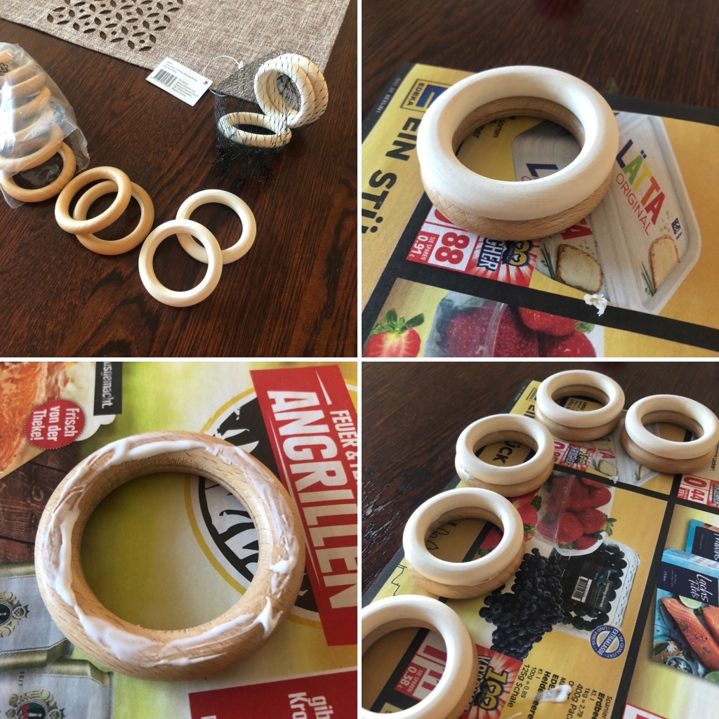 Ich habe für die Eierbecher Gardinenringe aus Holz in zwei verschiedenen Farbvarianten genommen. Einmal in einen hellen Holzton (gekauft bei Pflanzenkölle) und einmal in einen dunkleren Holzton (gekauft im Baumarkt Hellweg). Mir hat die Kombi der beiden Holztöne richtig gut gefallen.