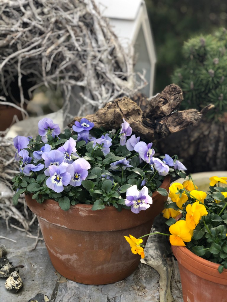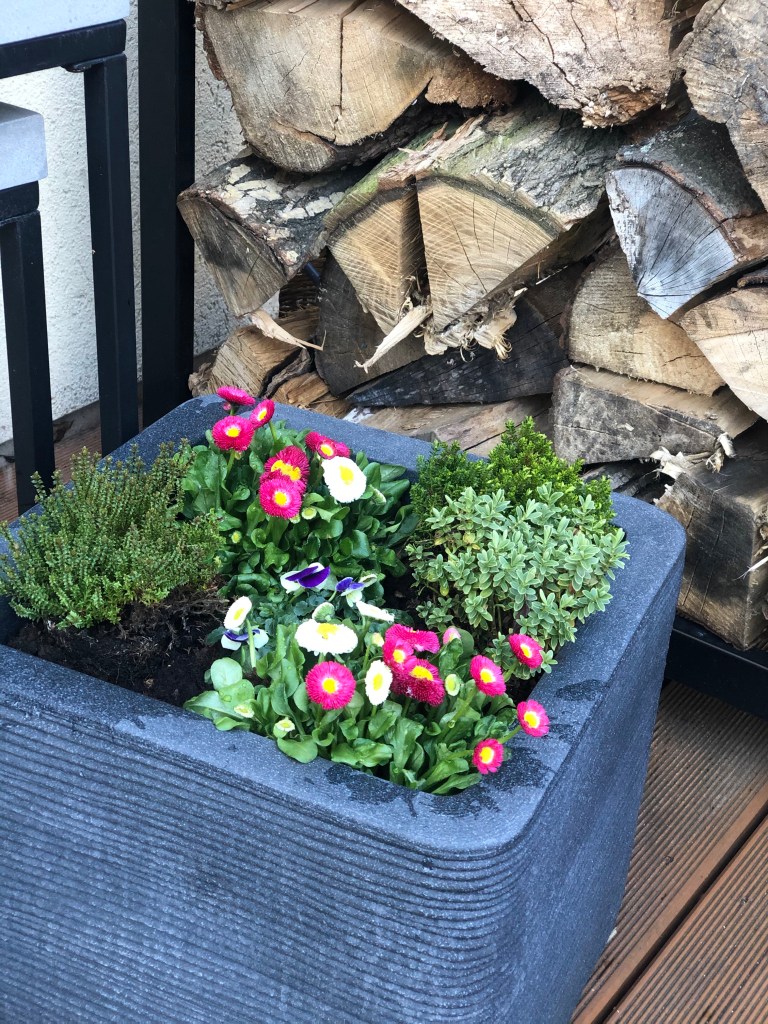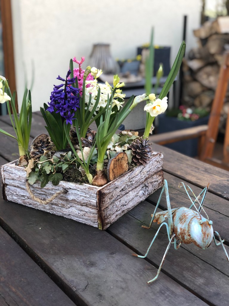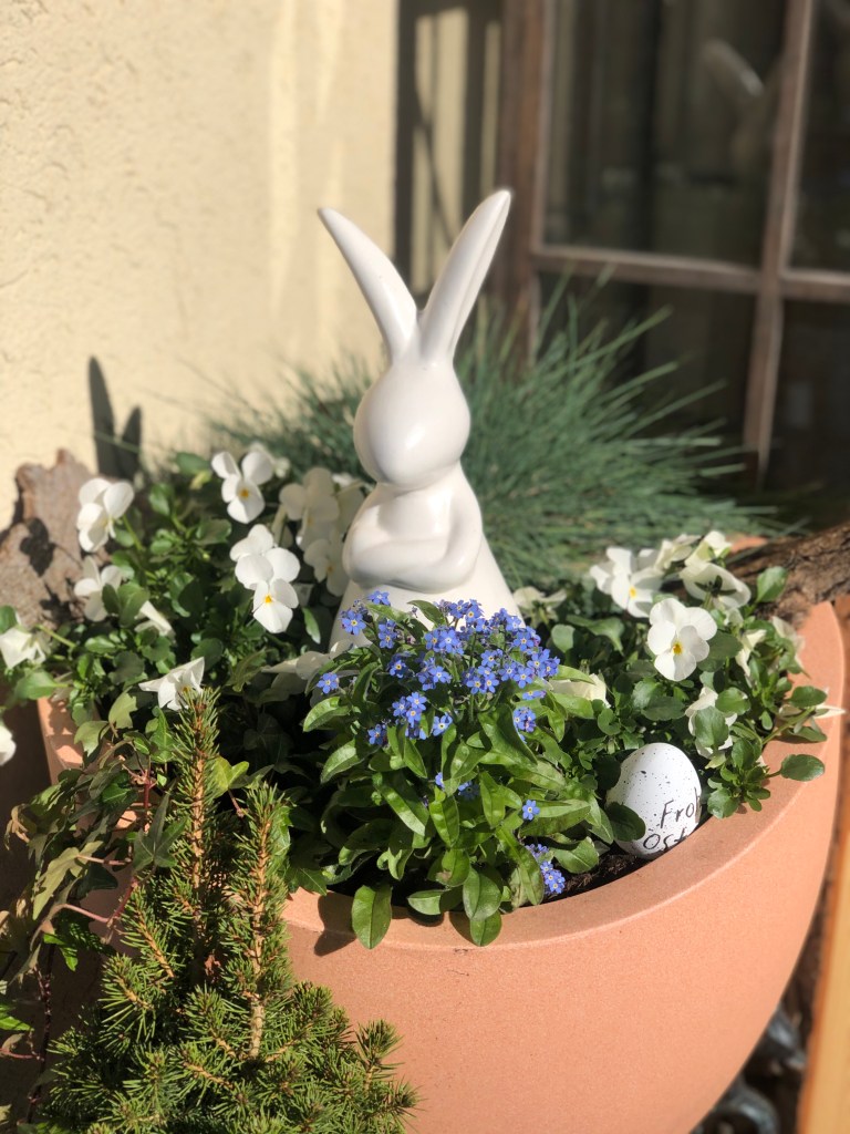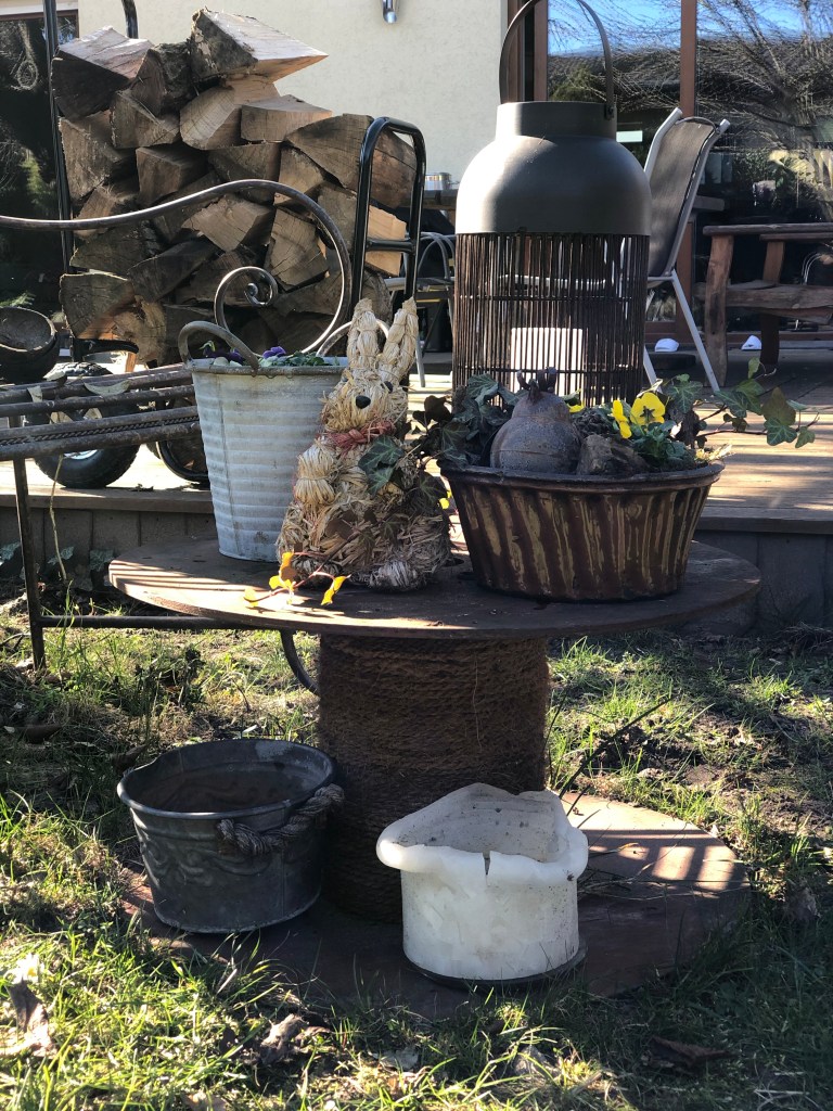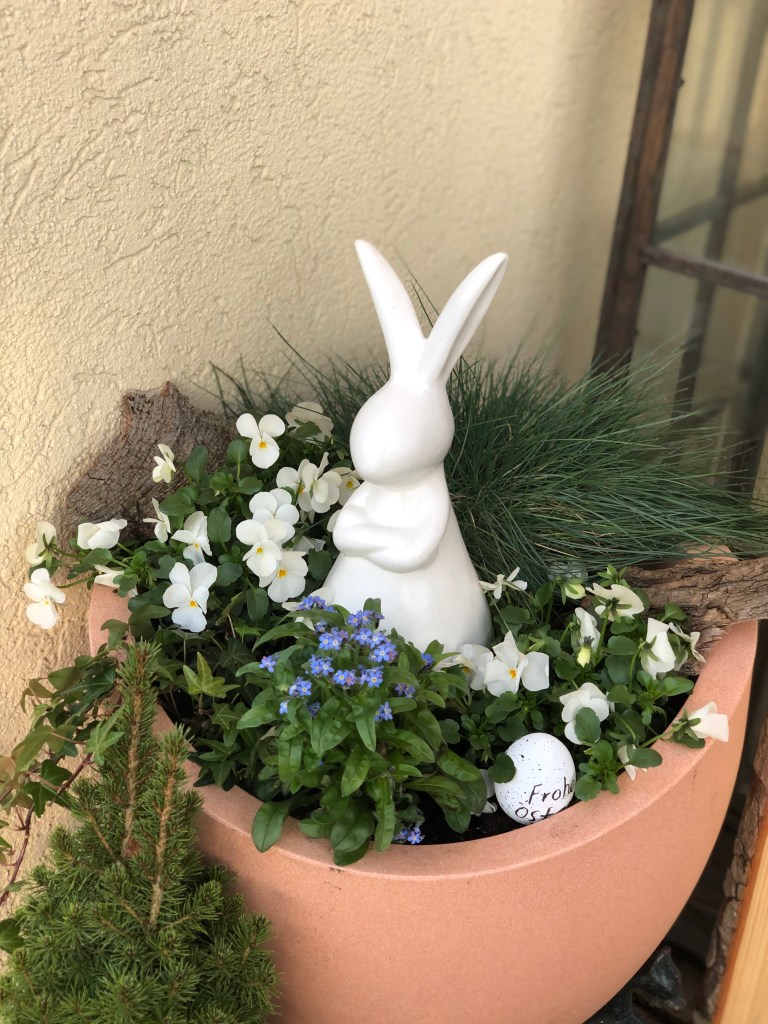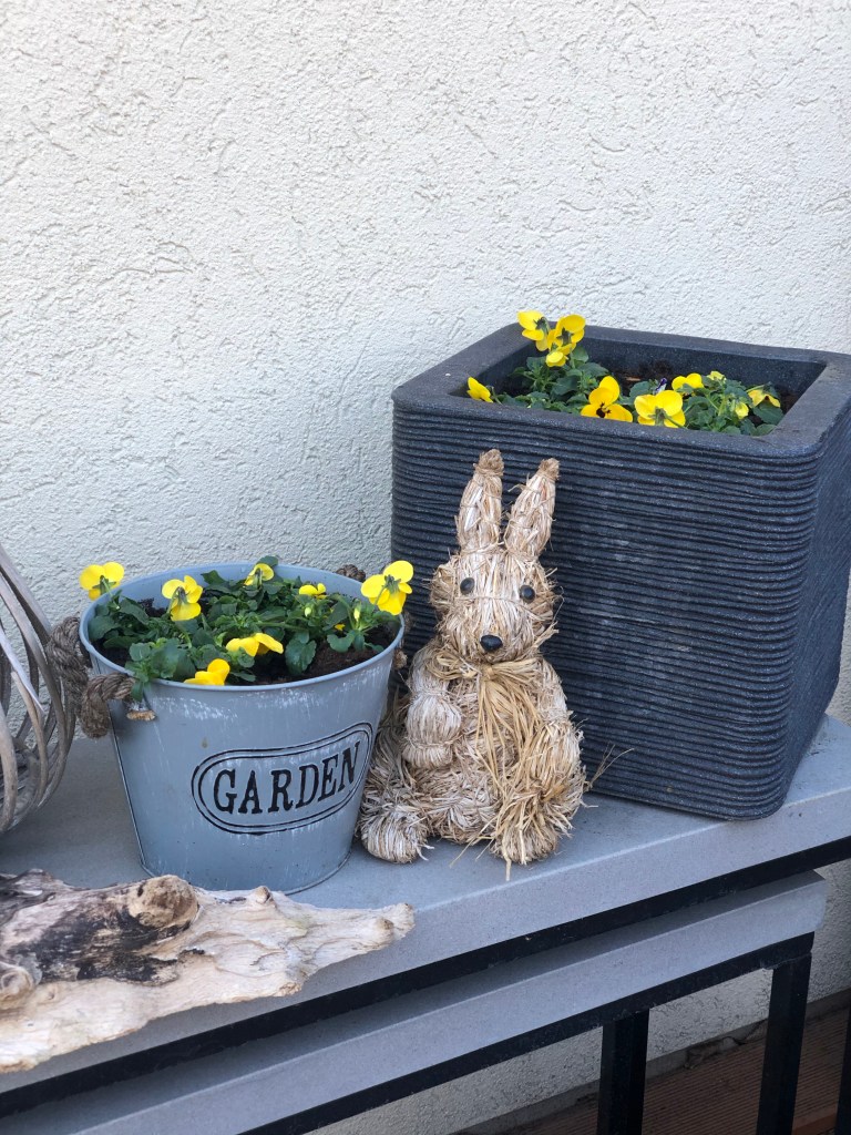 Nun habe ich meine Grundlage ausgeschmückt mit Osterhasen und Holzeiern sowie einen Stiefmütterchen als Mittelpunkt für den Tisch.