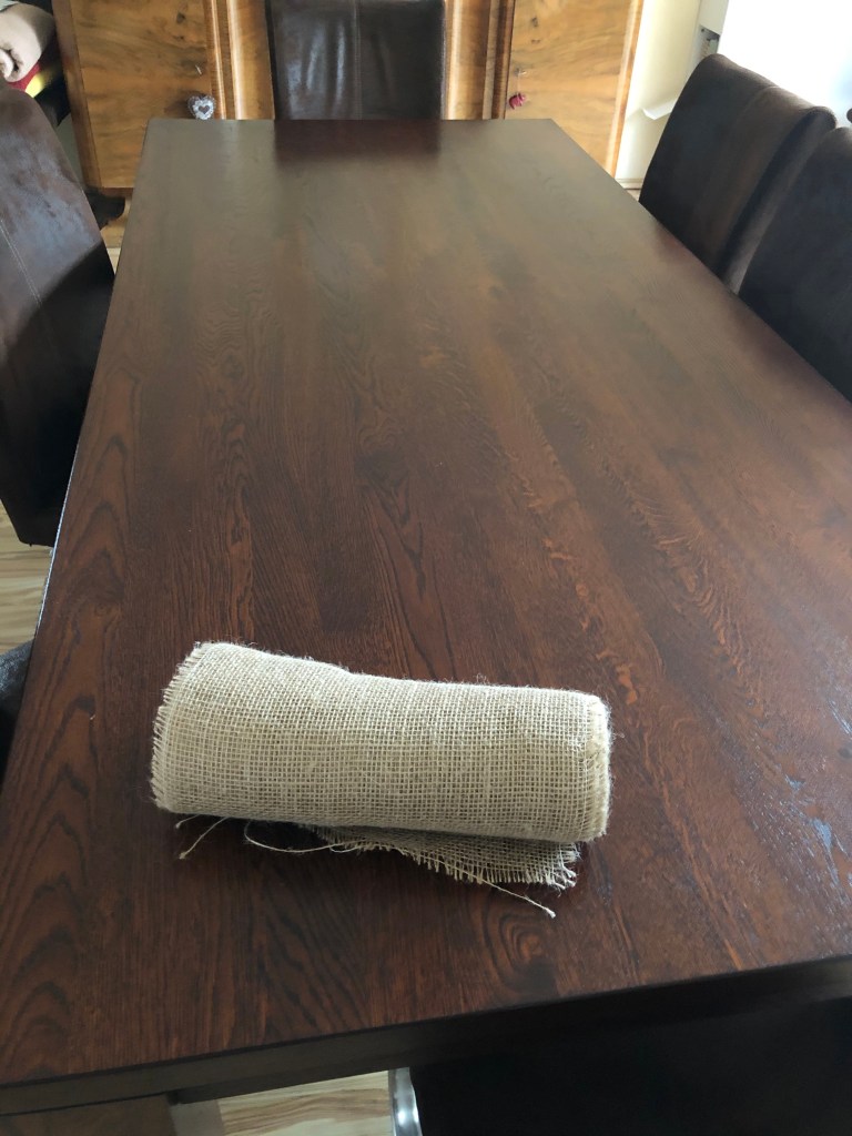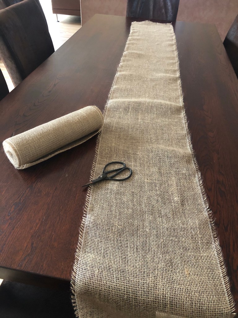 Als Grundlage für meine Tischdeko habe ich mir eine breites Juteband besorgt und diese habe ich mir als Tischläufer zurecht geschnitten.