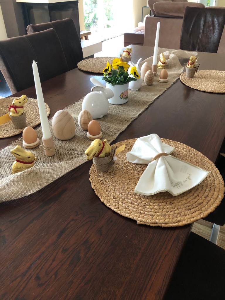 unser eigentlicher Plan war, das wir zur Osterzeit an die Ostsee fahren. Aufgrund der „Corona – Situation“ wird das ja wohl nichts …. Deshalb habe ich mir gedacht, dann machen wir es uns doch zu Hause schön und habe mir deshalb eine Tischdekoration für´s Osteressen ausgedacht. Dafür habe ich auch noch kleine DIY´s gebastelt. Wer meinen Blog verfolgt, der weiß das ich momentan ein totaler Fan von Naturtönen bin. Dieser Trend spiegelt sich auch in meiner Tischdeko für das Osterfest wieder.