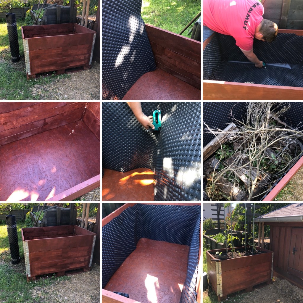 Nach dem die Lasur abgetrocknet ist, haben wir die Palette an Ort und Stelle des Hochbeetes gestellt und die Aufsatzrahmen darauf gesetzt. Das geht ganz einfach und man braucht hierzu kein handwerkliches Geschick. Danach haben wir zum Schutz für das Holz Noppenfolie mit den Noppen nach außen mit dem Tacker in dem Hochbeet befestigt.