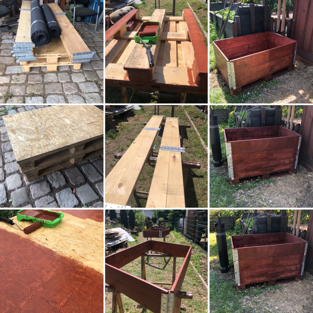 Wir haben eine OSB Platte auf eine Europalette geschraubt und dann die Palette und die Aufsatzrahmen mit Holzschutzlasur von innen und außen zweimal gestrichen.