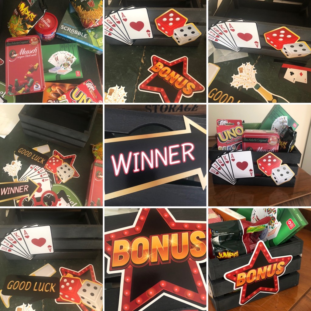 Zuerst habe ich die Kiste mit dem Photobomb – Set dekoriert. Das war ganz einfach, weil für die Motive (Karten, Würfel, usw.) Klebepunkte mit im Set dabei waren.