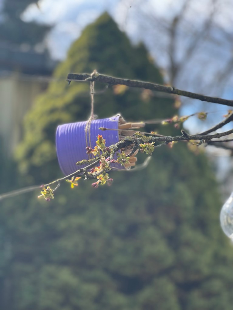 Nach dem die Farbe getrocknet ist, haben wir die Dosen mit den Naturmaterialien, Holzwolle und den Nisthilfen gefüllt. Wir haben die Dosen so eng befüllt, dass nichts mehr rausfallen kann.