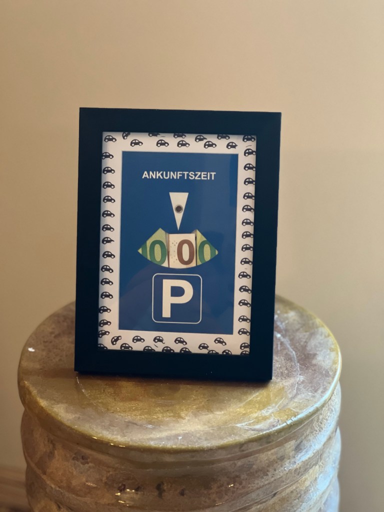 Ich habe den Bilderrahmen auseinander genommen und das Passepartout mit einen kleinen Stempel mit einem Automotiv bestempelt. Dann habe ich das Geld in die Parkuhr gesteckt. Danach habe ich das bestempelte Passepartout wieder in den Bilderrahmen gesteckt und dazu die Parkuhr. Die Parkuhr habe ich mit Klebestreifen fixiert damit sie nicht verrutscht. Dann habe ich den Rahmen wieder verschlossen. Fertig ist das Geldgeschenk.