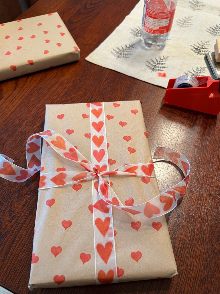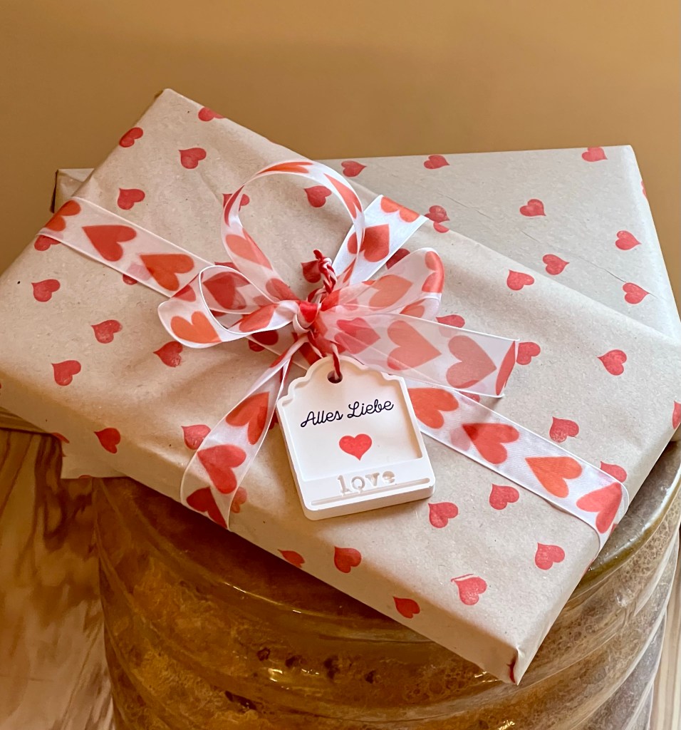 Ich habe mir mal wieder einfaches Packpapier genommen und dieses passend zum Valentinstag mit roter Stempelfarbe und Herzstempel bestempelt.