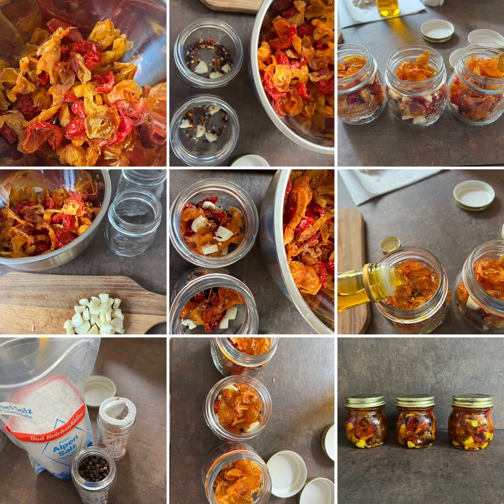 Ich habe die gedörrten Tomaten in Gläser (vorher mit gekochten Wasser ausgespült) gelegt und Schichtweise Knoblauch, Chiliflocken, Pfeffer und Salz hinzugegeben. Dann habe ich alles mit dem Öl aufgegossen und die Gläser verschlossen.