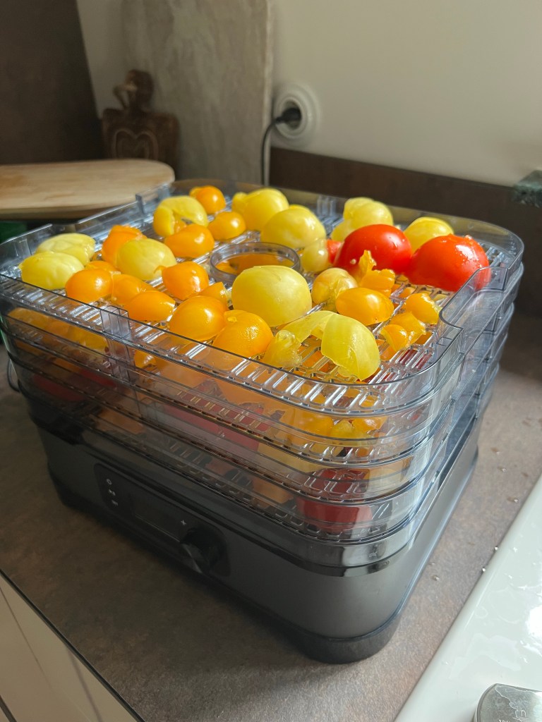 Vorher habe ich sie ordentlich gewaschen und abgetrocknet. Danach habe ich sie halbiert und das Kerngehäuse entfernt. Die Dörrplatten habe ich vorher eingeölt, damit die Tomaten nach dem dörren besser abgelöst werden. Dann habe ich die Hälften der Tomaten für mindestens 10 Stunden bei 45 Grad gedörrt.