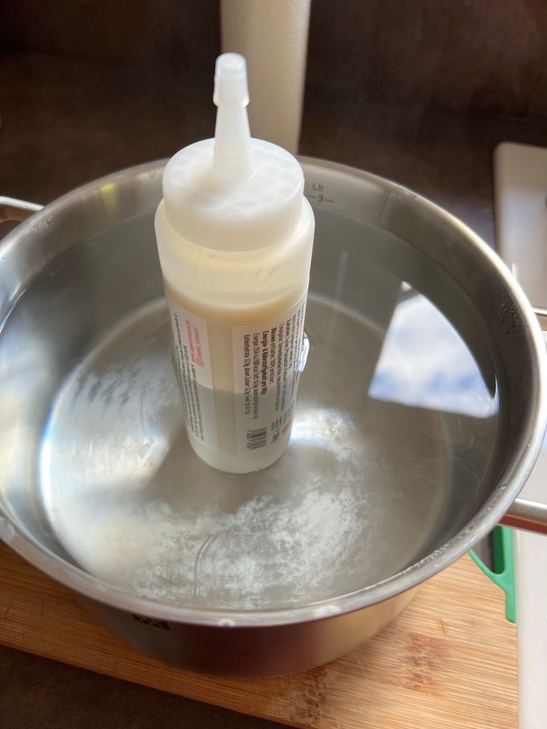 Dann habe ich die Sahne glatt gerührt und wieder auf der Torte gleichmäßig verteilt. Zwischenzeitlich habe ich den Superdrip im Wasserbad flüssig gemacht.