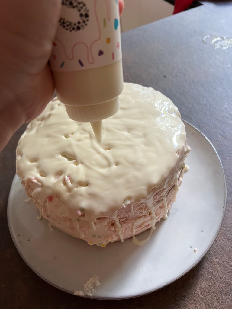Als der Superdrip flüssig war, habe ich ihn auf der Torte verteilt und ungleichmäßig am Rand runterlaufen lassen.