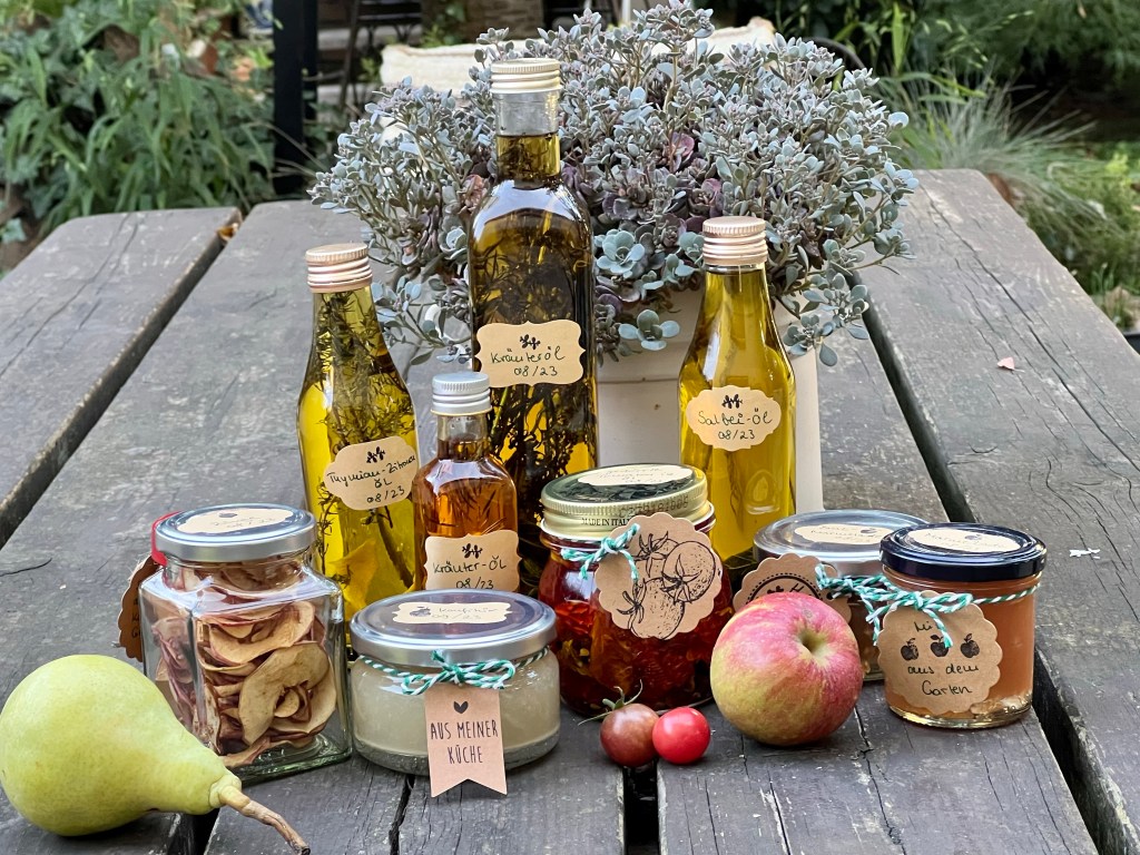ich liebe ja den Spätsommer und diesen möchte man doch am liebsten für die grauen regnerischen Tage konservieren. Da das leider nicht mit dem Wetter klappt, habe ich einfach die Früchte, Kräuter und Gemüse aus unserem Garten, und aus den Gärten von meiner Mutter und Schwiegereltern konserviert in Form von Kräuteröl, Marmeladen, dörren und vieles mehr. In meinen heutigen Beitrag zeige ich Euch, was ich in den letzten Wochen in meiner Küche gewerkelt habe.
