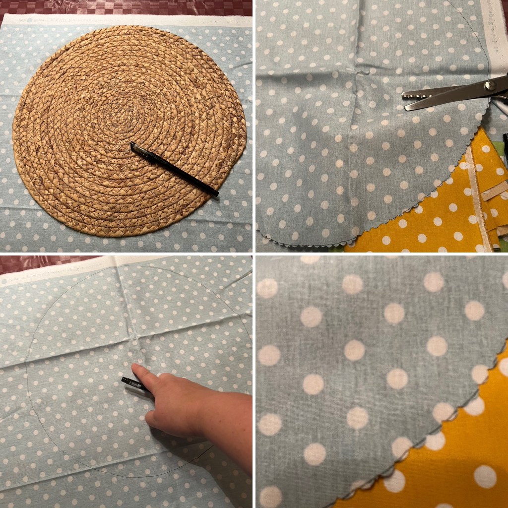 Ich habe eines meiner Platzsets als Vorlage verwendet und dieses grob mit einen Stift auf den Stoff gezeichnet. Dann habe ich den Kreis mit einer Zackenschere für Stoff ausgeschnitten. Es geht natürlich auch eine andere Stoffschere, aber bei einer Zackenschere ist es nicht ganz so auffällig, wenn man sich mal verschneidet. 😅
