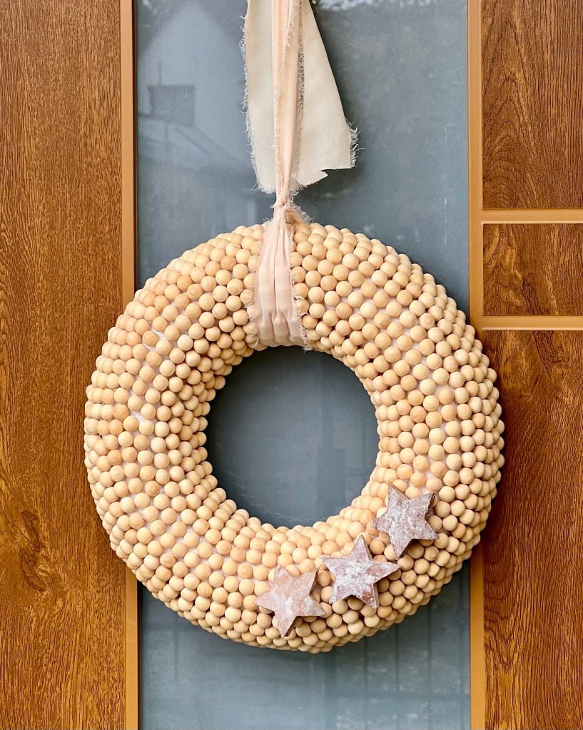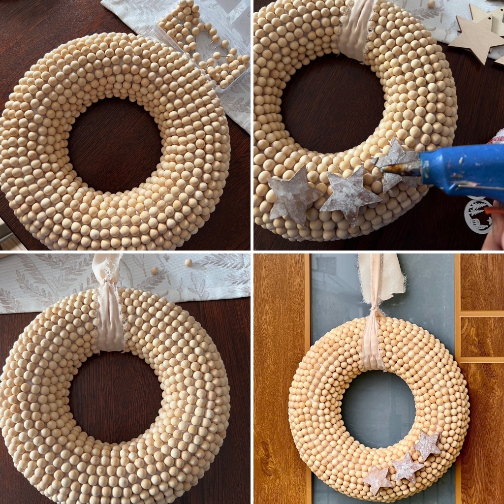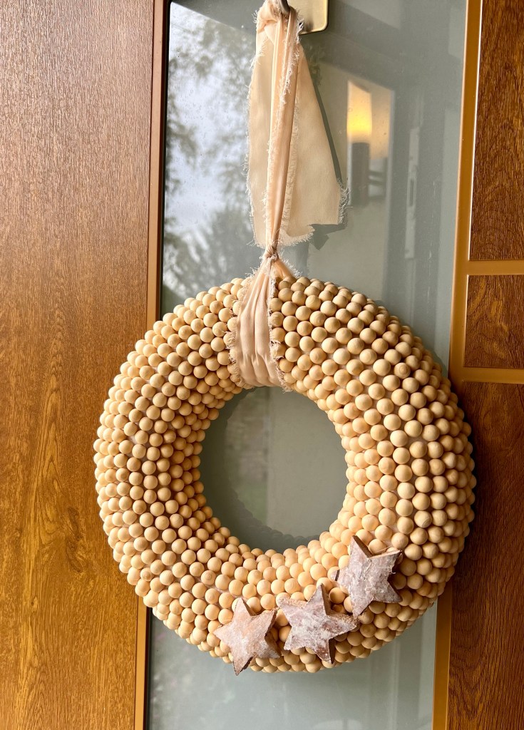 Dann habe ich ein Band um den Kranz gebunden und für eine schöne Verzierung habe ich noch drei Holzsterne mit der Heißklebepistole dran geklebt.