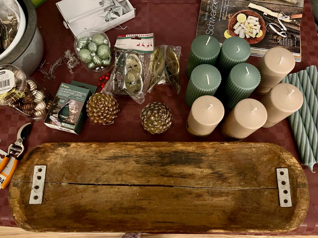 hinter mir liegt ein kreatives Wochenende. Unter anderem habe ich für mein Esstisch ein Weihnachtsgesteck gebastelt. Ich habe mich dieses Jahr gegen einen Kranz entschieden, weil ich etwas längeres für meinen Tisch haben wollte.