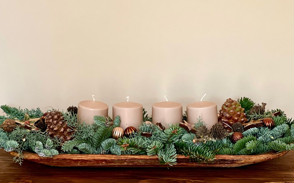 Ich habe bei den Berliner Landjungs im Online- Shop eine alte rustikale Teigschale entdeckt und da ist die Idee mit dem Weihnachtsgesteck entstanden.