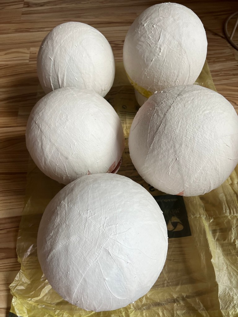 Dann habe ich den Luftballon auf eine kleine Schüssel gesetzt. Nun habe ich die Gipsbinden in mehreren Schichten auf den Ballon gelegt und diese dann nass gemacht. Dabei habe ich die Binden an den Ballon gedrückt und den Gips verschmiert. Am Besten den Tisch gut abdecken, weil das eine ganz schöne Matscherei ist.