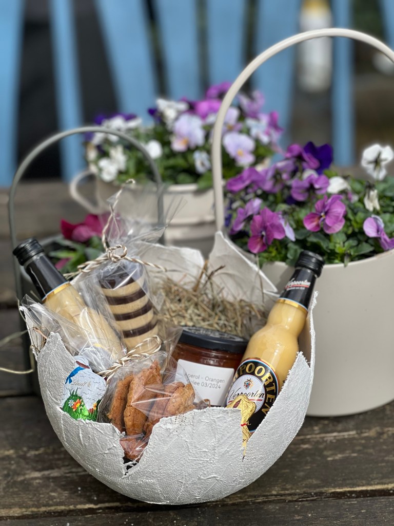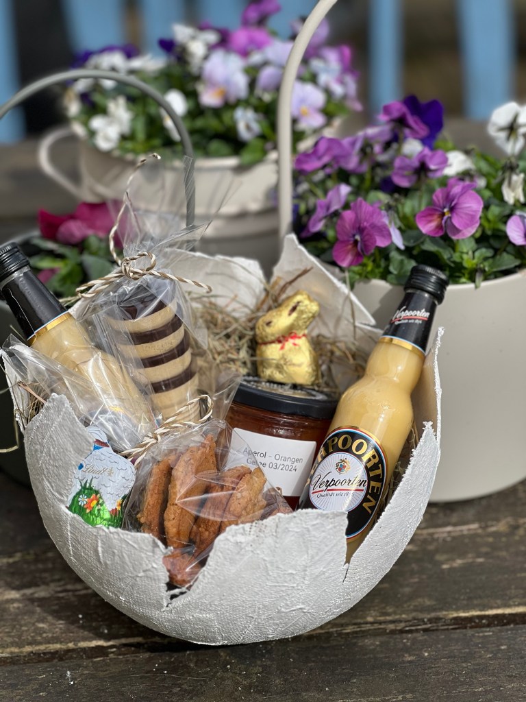 Ich habe nun die Schalen mit Holzwolle gefüllt und meine kleinen Osterüberraschungen wie selbst gemachtes Mandariengelee, Aperol – Orangengelee und selbst gebackene Haferkekse sowie gefärbte Ostereier hinein gelegt.