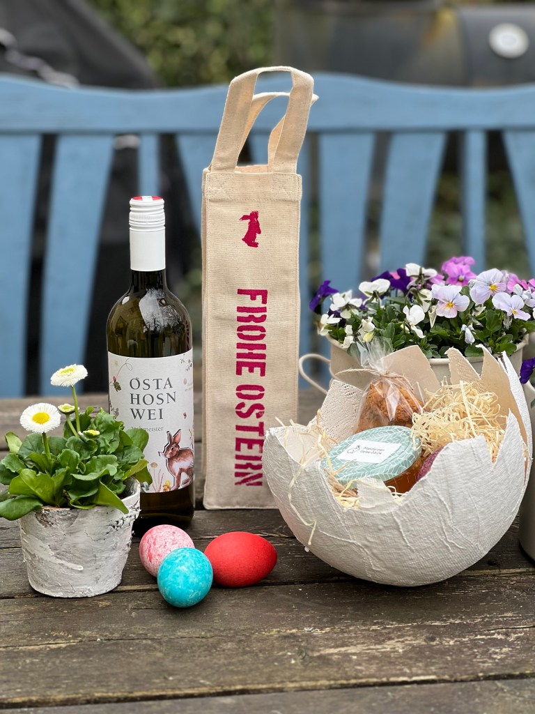 Und da wir dieses Jahr viele Einladungen haben, habe ich noch eine dritte Osternestvariante für Erwachsene. Ich habe mehrere Flaschen „Ostahosnwei“ vom Weingut Zechmeister bestellt. Dafür habe ich Weintaschen (über Amazon) besorgt und habe die Taschen mit Siebdruck verschönert.