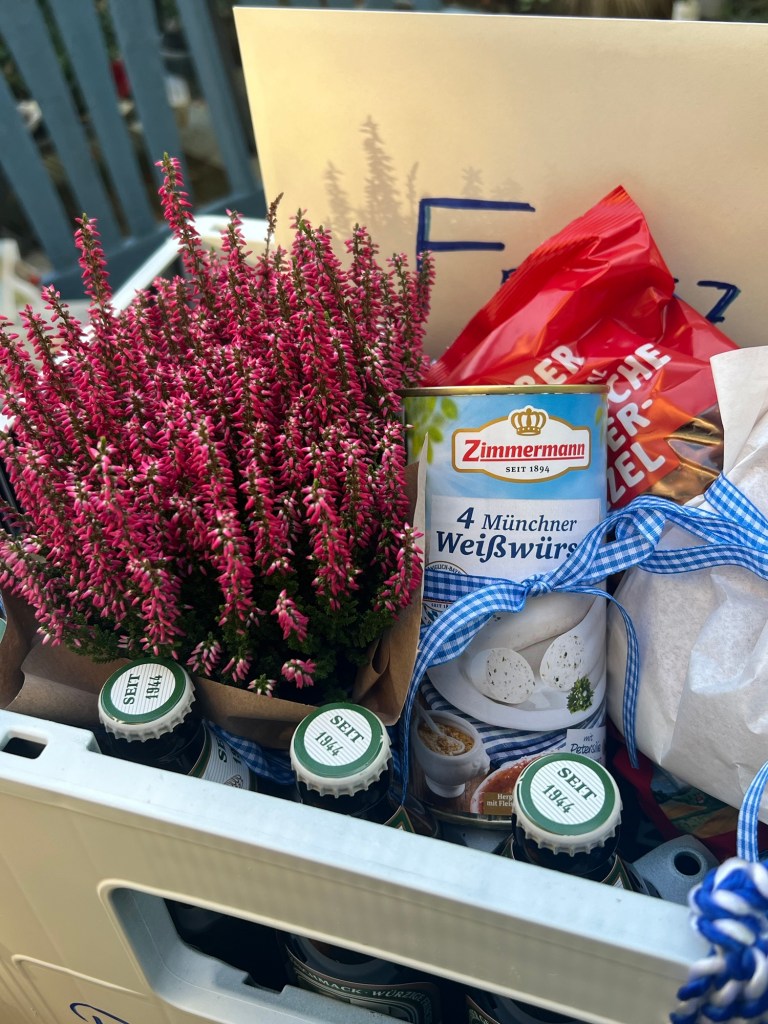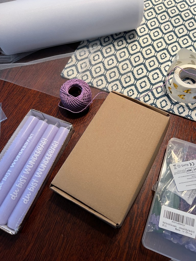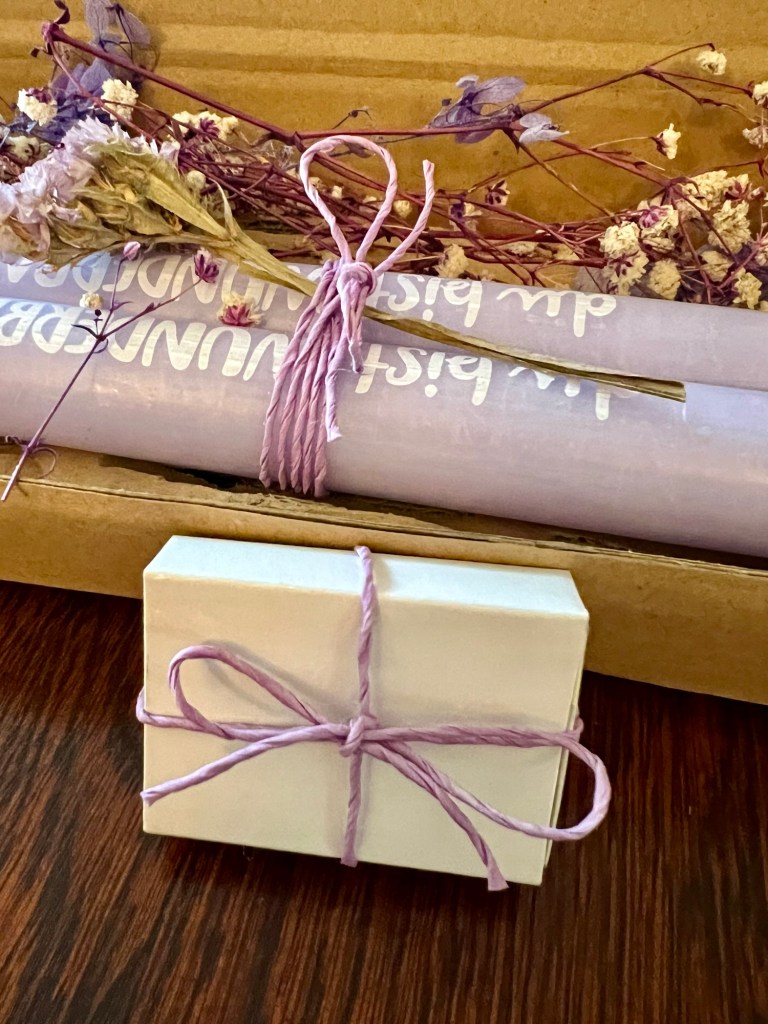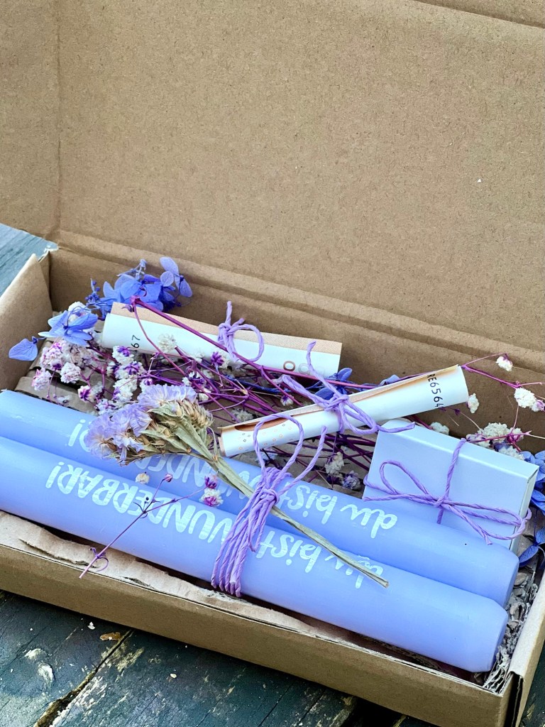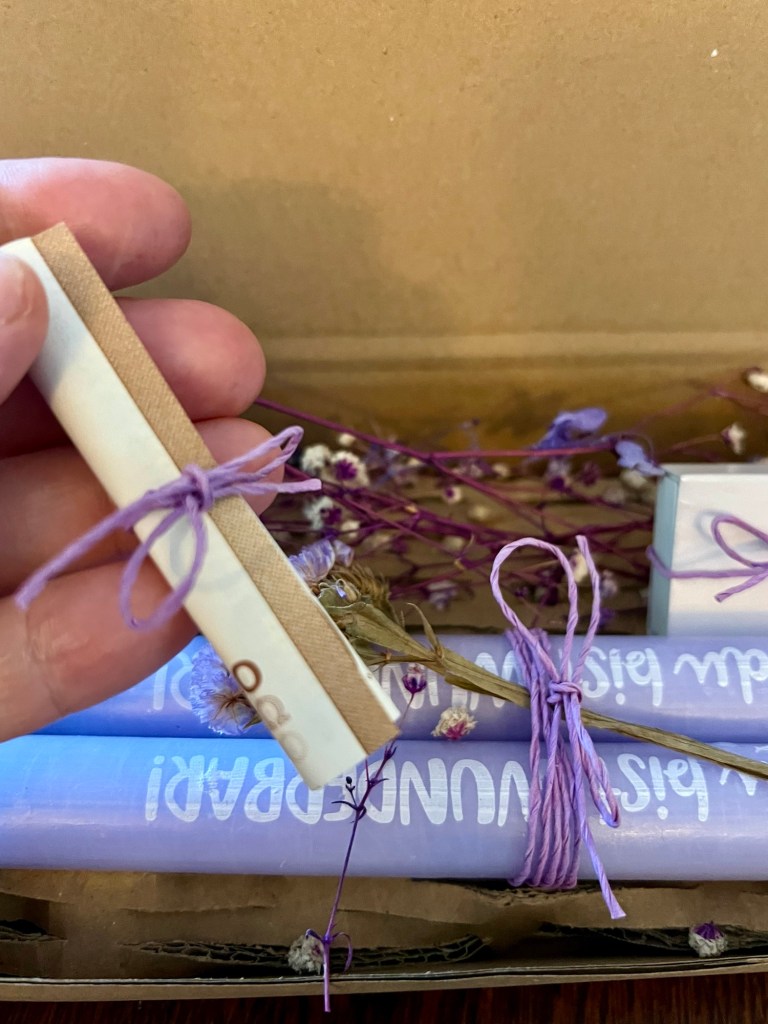 Ich habe dafür ein paar Kerzen (im Kaufland) mit der Aufschrift: „Du bist wunderbar“ besorgt, Dazu einen kleinen Pappkarton, kleine Streichholzschachtel, lila Band und Trockenblumen.