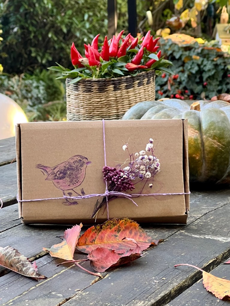 Nun habe ich die Schachtel verschlossen und auch mit dem Band verschönert und mit Trockenblumen dekoriert.