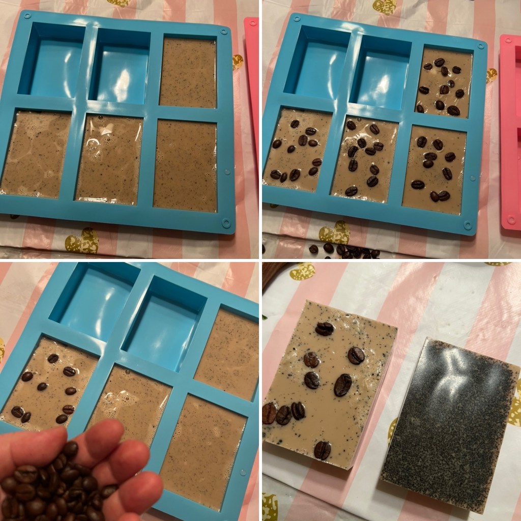 Dann habe ich die flüssige Seife in die Silikonform gegossen und relativ schnell die Kaffeebohnen darauf verteilt. Dann muss die Seife nur noch aushärten und fertig ist die Kaffeeseife.