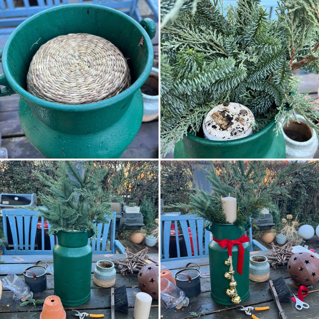 Dann habe ich in die Kanne ein paar Töpfe gestellt, damit ich für die Kerze eine richtige Ebene bekomme. Rund herum habe ich unterschiedliche Tann- und Thujazweige gesteckt. Dann habe ich eine rote Samtschleife um die Kanne gebunden und goldene Glocken (von Tchibo) dazu gehängt.