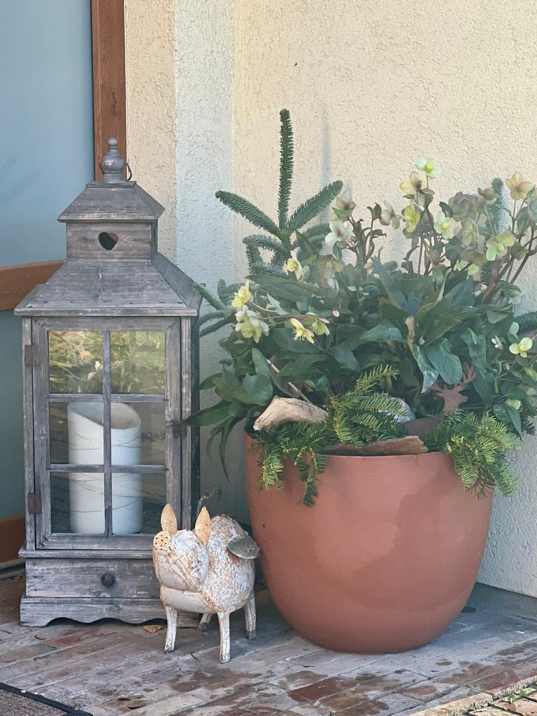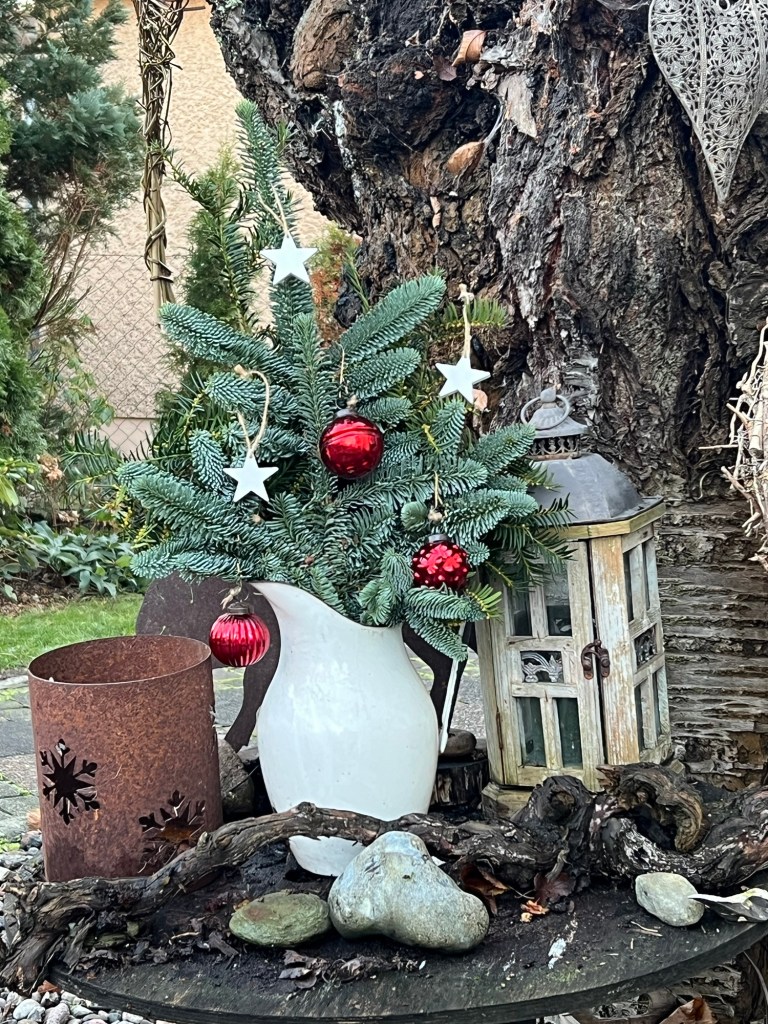 Manchmal ist weniger mehr. Mir gefällt er richtig gut. Außerdem habe ich unseren Eingangsbereich mit zwei großen Christrosen und etwas Tanne gestaltet.