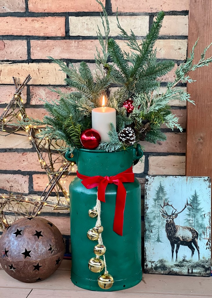 Ich habe von meiner lieben Schwiegermutter eine alte Milchkanne geschenkt bekommen. Ich mag zwar den rostigen Look, aber für Weihnachten habe ich der Kanne ein Update gegeben.