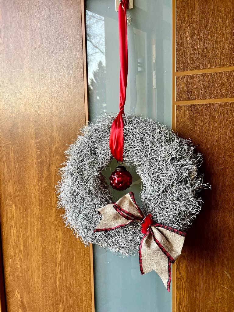 Hierfür habe ich einen fertigen grauen Kranz gekauft und diesen ganz einfach mit einen roten Band, roter Kugel und Schleife aufgepimt.