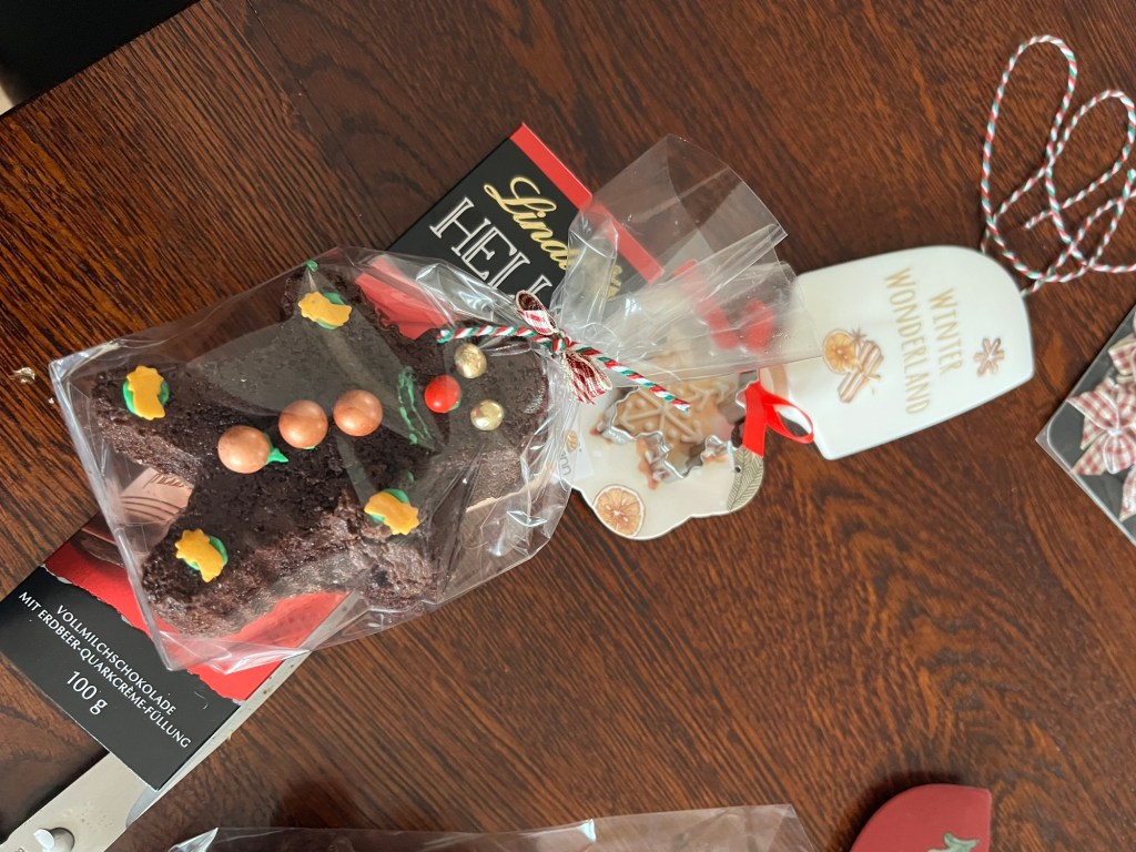 Diese habe ich dann in eine kleine Tüte verpackt, dazu gibt es noch eine Tafel Schokolade und einen Teigschaber. Für den Teigschaber habe ich mich entschieden, weil doch in der Weihnachtszeit viel Plätzchen backen.